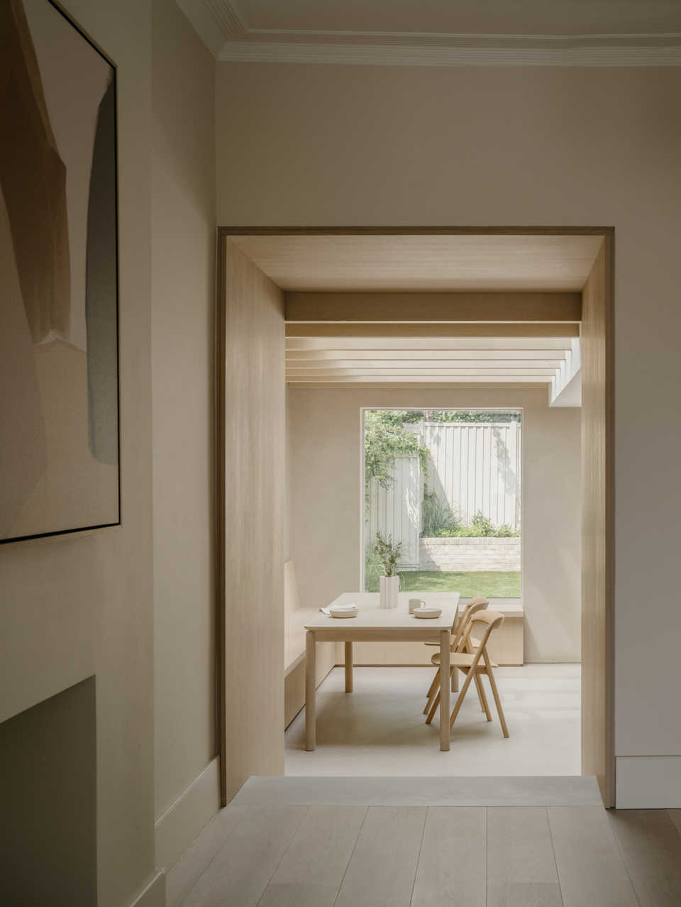 A timber-lined portal forms a clear threshold between old and new, creating a moment of compression before opening into the extension beyond. This element frames long sightlines through the house, strengthening visual connections from front to rear and allowing natural light to travel deep into the plan. It acts as both a spatial marker and a crafted transition.
