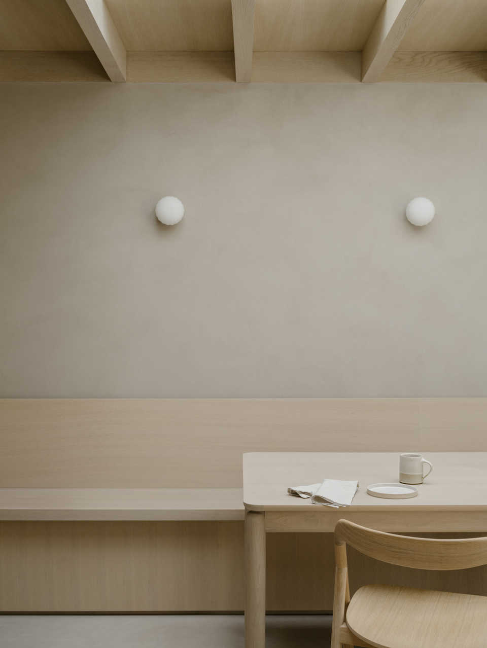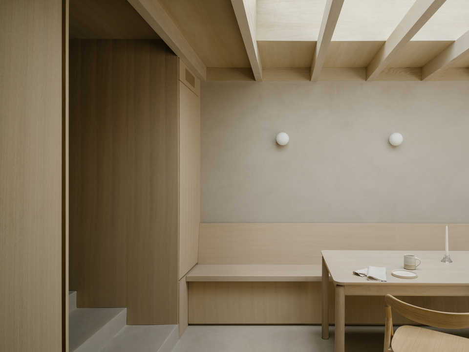 The kitchen is defined by a restrained palette of calm, natural materials and finely detailed bespoke joinery. Soft timber tones, integrated storage and minimal detailing create a space that feels functional yet understated. Texture and proportion take precedence, allowing the room to feel quietly resolved and robust for everyday use.