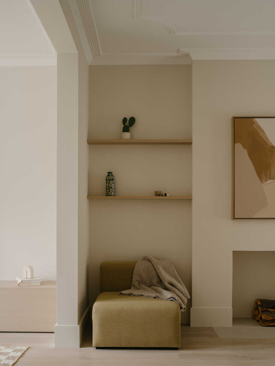 The lounge retains the home’s more traditional architectural detailing, with cornicing and proportions carefully respected. A consistent tonal palette and considered joinery help tie this space back to the newer interventions, creating continuity across the house. The result is a calm, balanced room that feels both familiar and refreshed.