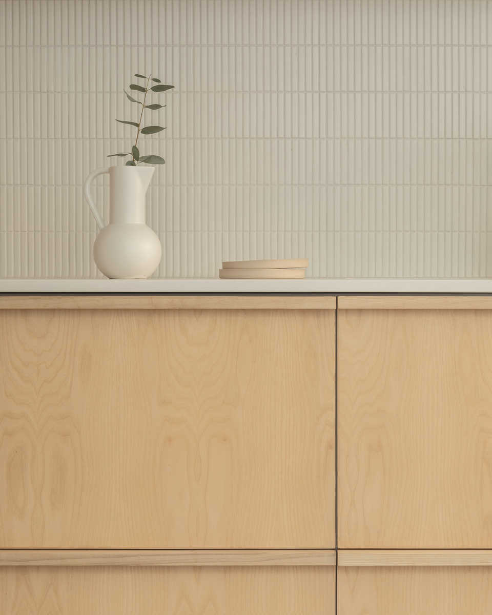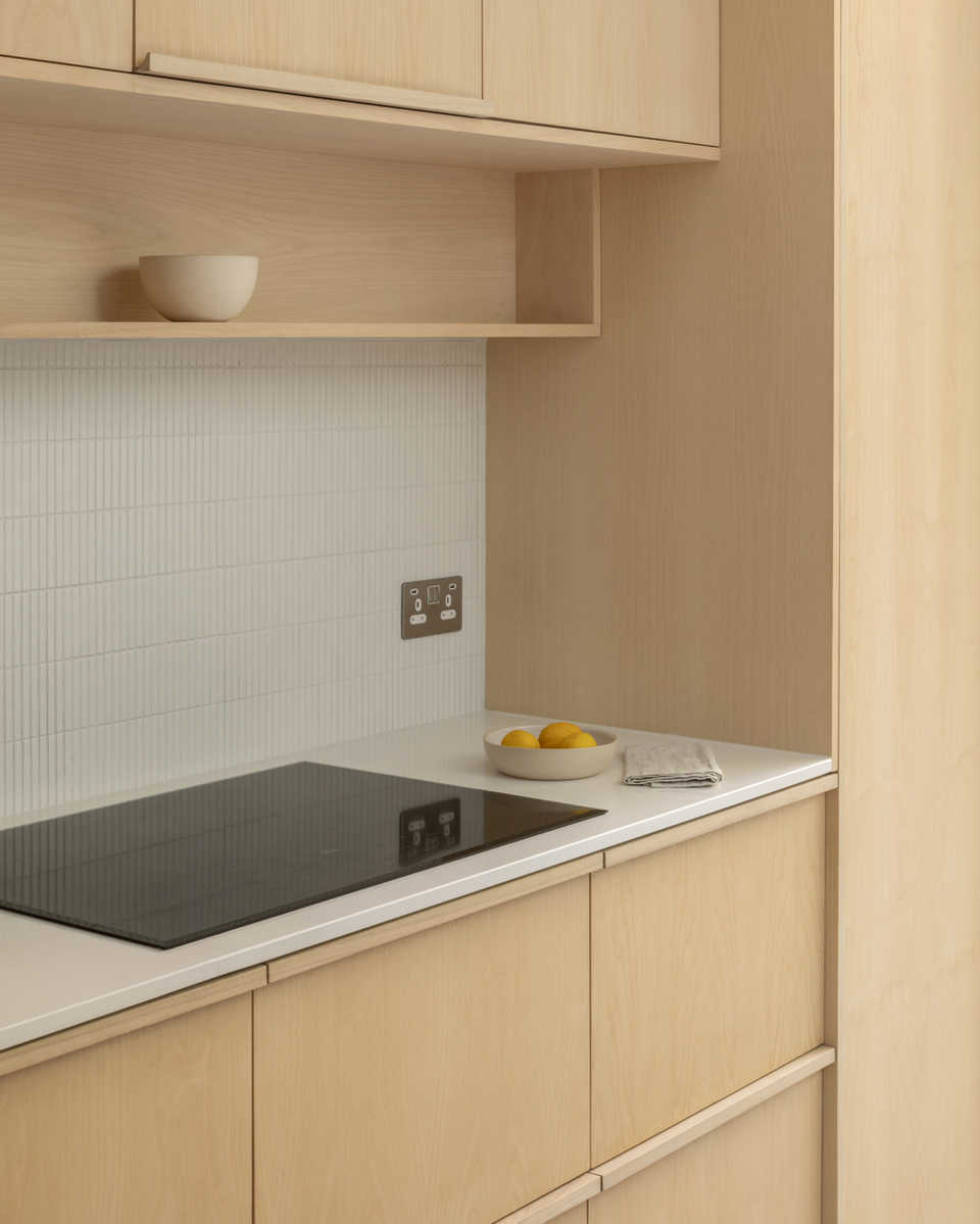 The internal space contrasts the external design with muted tones that achieve a calm and relaxing environment. The kitchen design is bespoke and was developed alongside a joiner. It is finished in Ash, a naturally light timber with a subtle grain. The concrete floors have a sandy undertone that echoes the pigments of the timber. The walls are finished with a lime paint, which adds a layer of softness, particularly as shadows from the exposed rafters cascade down the wall.