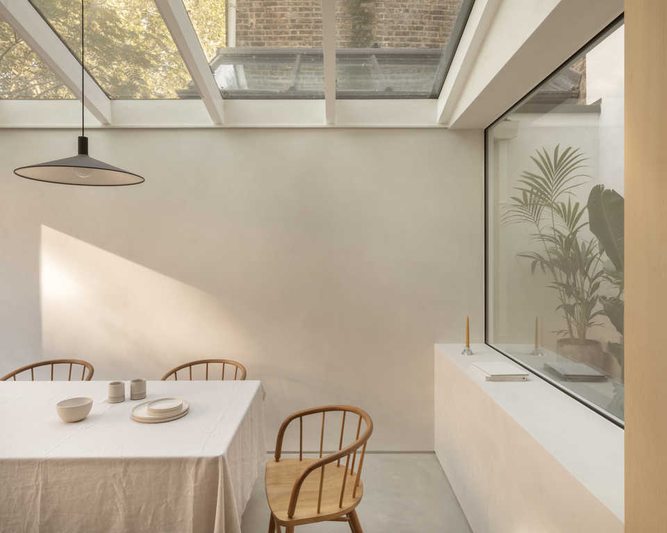 The relationship with natural light was pivotal to the scheme and the extension benefits from a triple outlook: a large sliding door on the rear elevation, an expanse of roof glazing on the side return and a glazed window to the newly formed courtyard — each providing glimpses of greenery from new planters or existing mature trees.