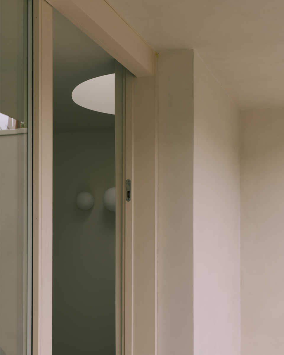 Natural light was a key consideration throughout the design. Two semi-circular roof lights introduce soft, shifting patterns of light and shadow, which evolve throughout the day. The overhanging roof and textured microcement further enhance this interplay, bringing depth and variation to the space.