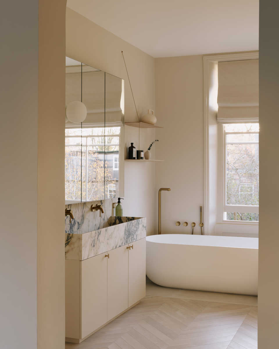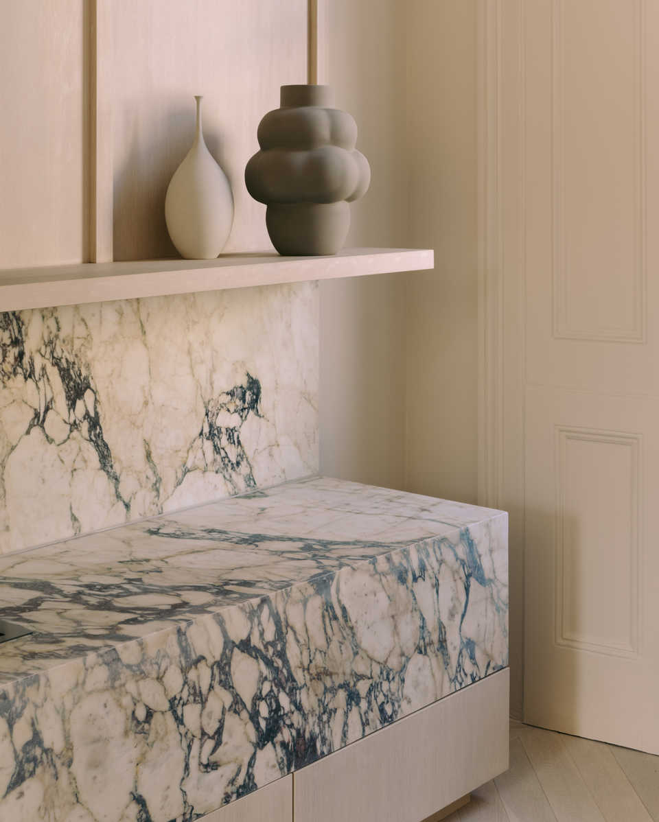 The lounge, study, and bedrooms on the upper floors feature light oak and marble, complemented by traditional detailing. These materials add a sense of warmth and refinement, creating a timeless atmosphere.
